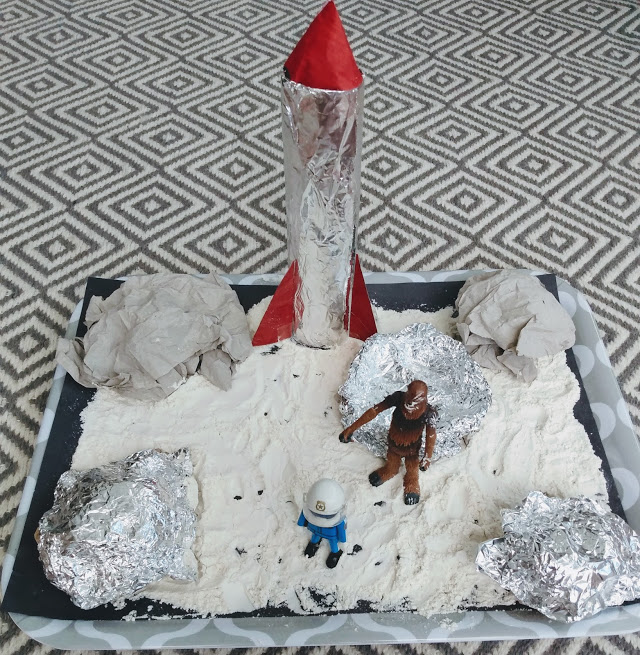 Sprinkle some flour onto a tray. Find some characters to be your astronaut and creature. Make a model rocket using junk modelling. Model a landscape using real rocks and pebbles or make some using pliable materials such as screwed up paper and foil. Then retell the story using your characters and props.