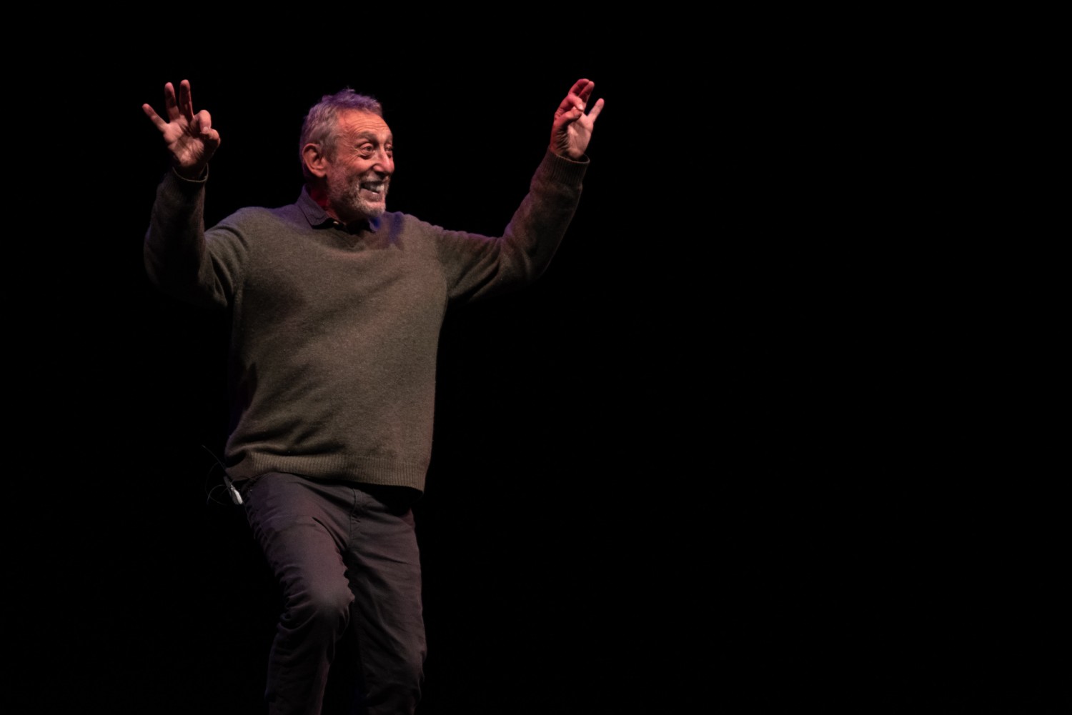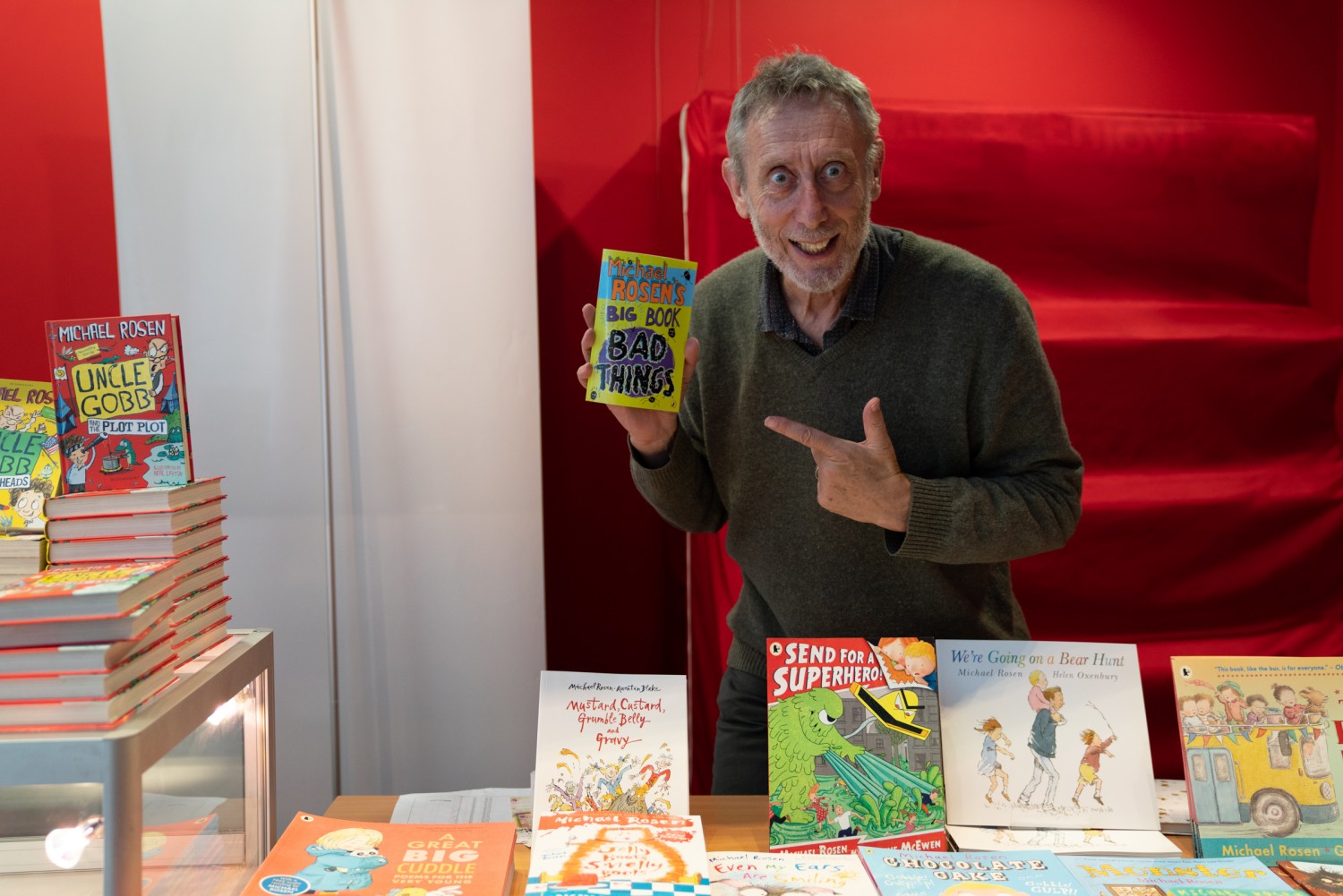 Thirteen Leicester primary schools bought over 800 children to see Michael Rosen’s performance at the Curve Theatre. Michael delighted the audience with his hilarious poems and childhood stories, and gave seriously good tips on how to get writing poetry. After the show, Michael met some of the children and signed the books they had bought from the bookstall run by Kibworth Bookshop.
