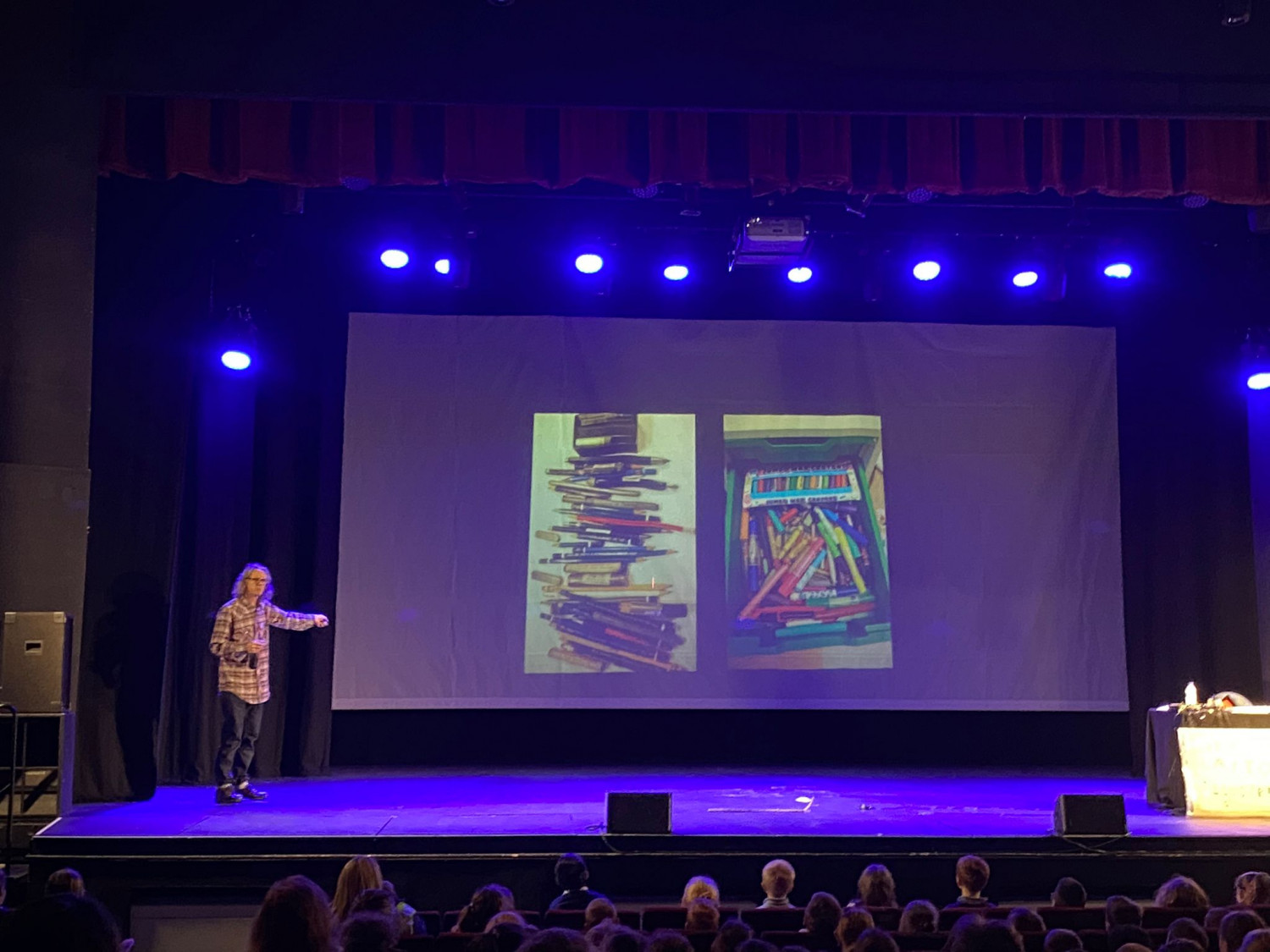 After giving a personal shout to every school, Neal showed us intriguing photos of the media he uses to create his work. Fat crayons, fine pens, messy ink, stubby pencils, all used along with scissors and glue to create Neal’s distinctive collage effect.
