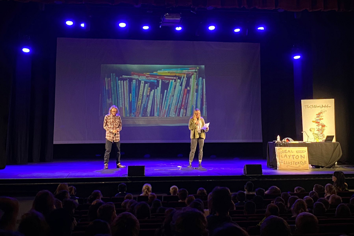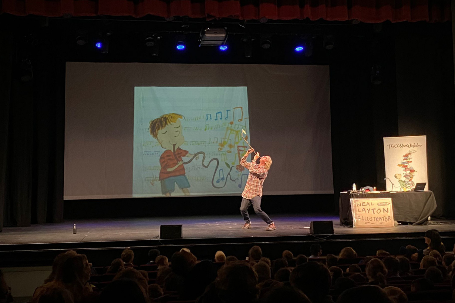 A bright blue sky was the fitting backdrop for over 750 children and teachers from 9 local primary schools to arrive at Weymouth Pavilion this morning, to see the immensely talented author and illustrator, Neal Layton, live on stage.