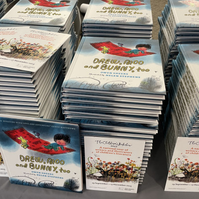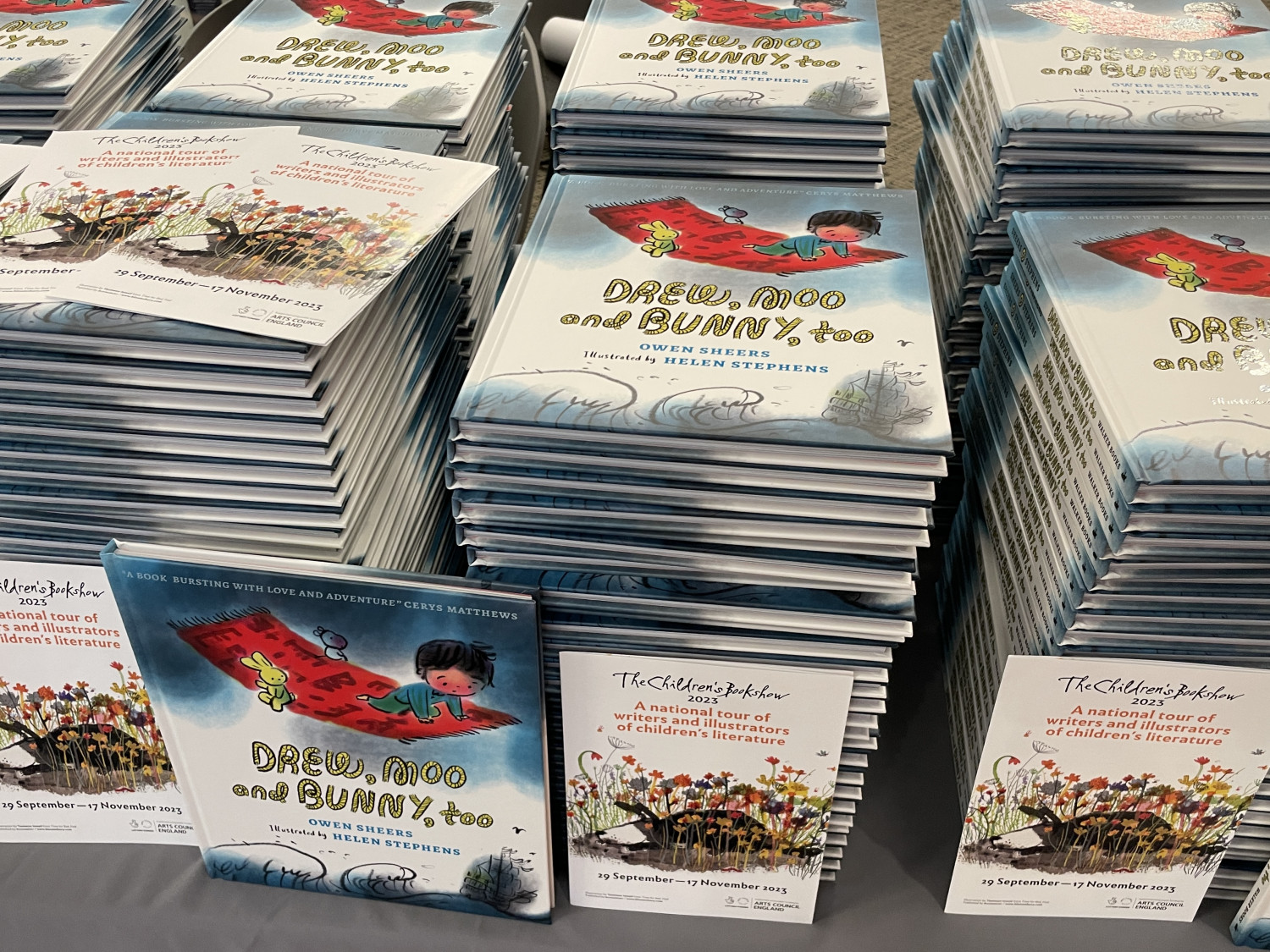 What an utterly magical morning we spent with illustrator extraordinaire Helen Stephens and lyrical poet and writer Owen Sheers at the Warwick Arts Centre. The audience of over 400 year 3 and 4 children and teachers were transfixed as we listened to Owen read extracts from their beautiful book Drew, Moo and Bunny, Too while Helen effortlessly and skilfully illustrated accompanying scenes live on stage. With pirates, adventure, friendship and magic carpets, you could hear a pin drop - it was so spellbinding! Thank you to all who came. And how wonderful to give every child a free copy of Drew, Moo and Bunny, Too to take home and keep.